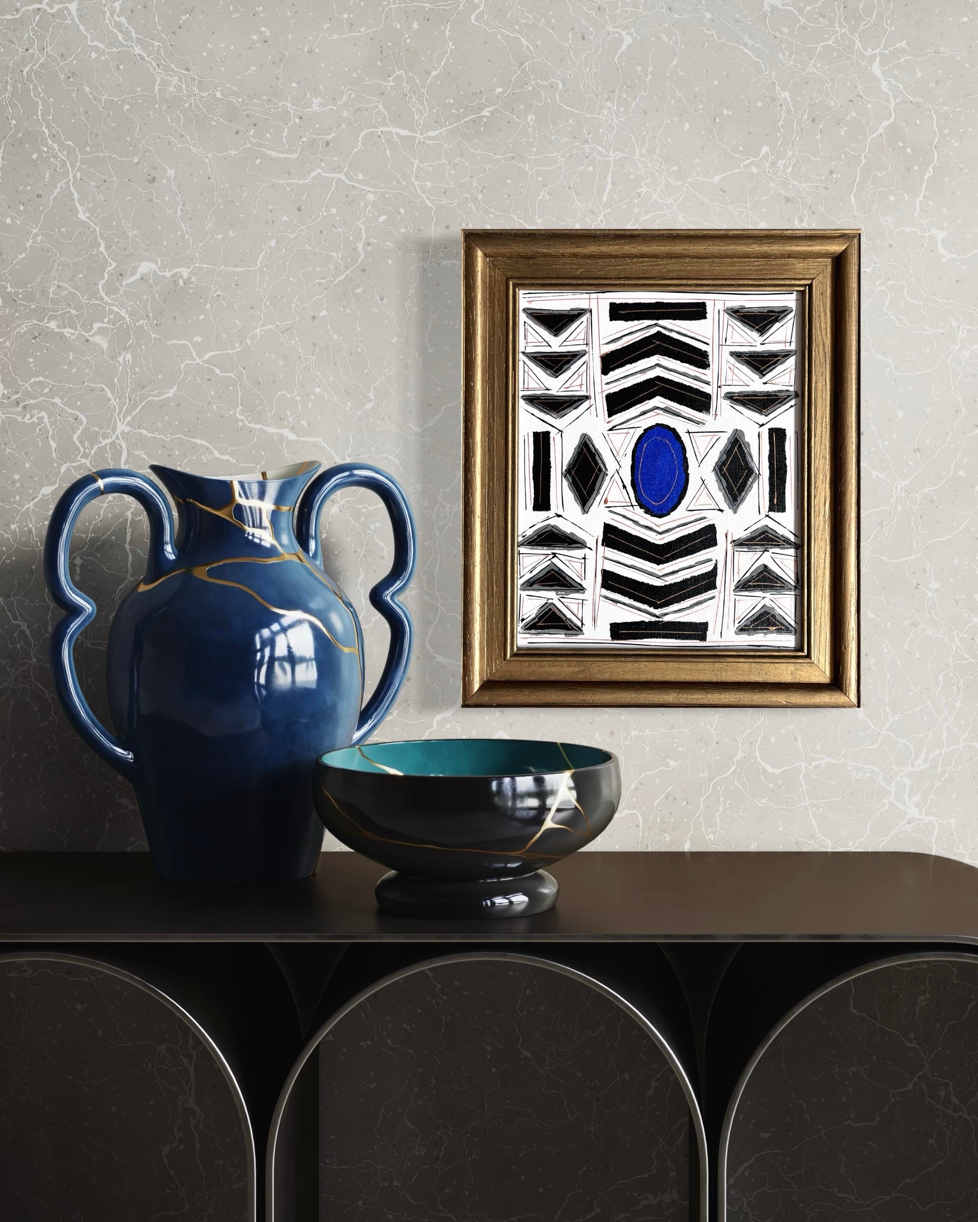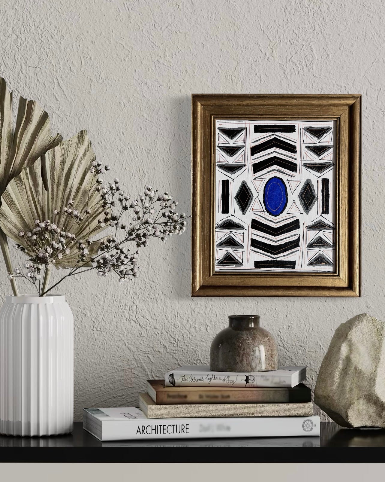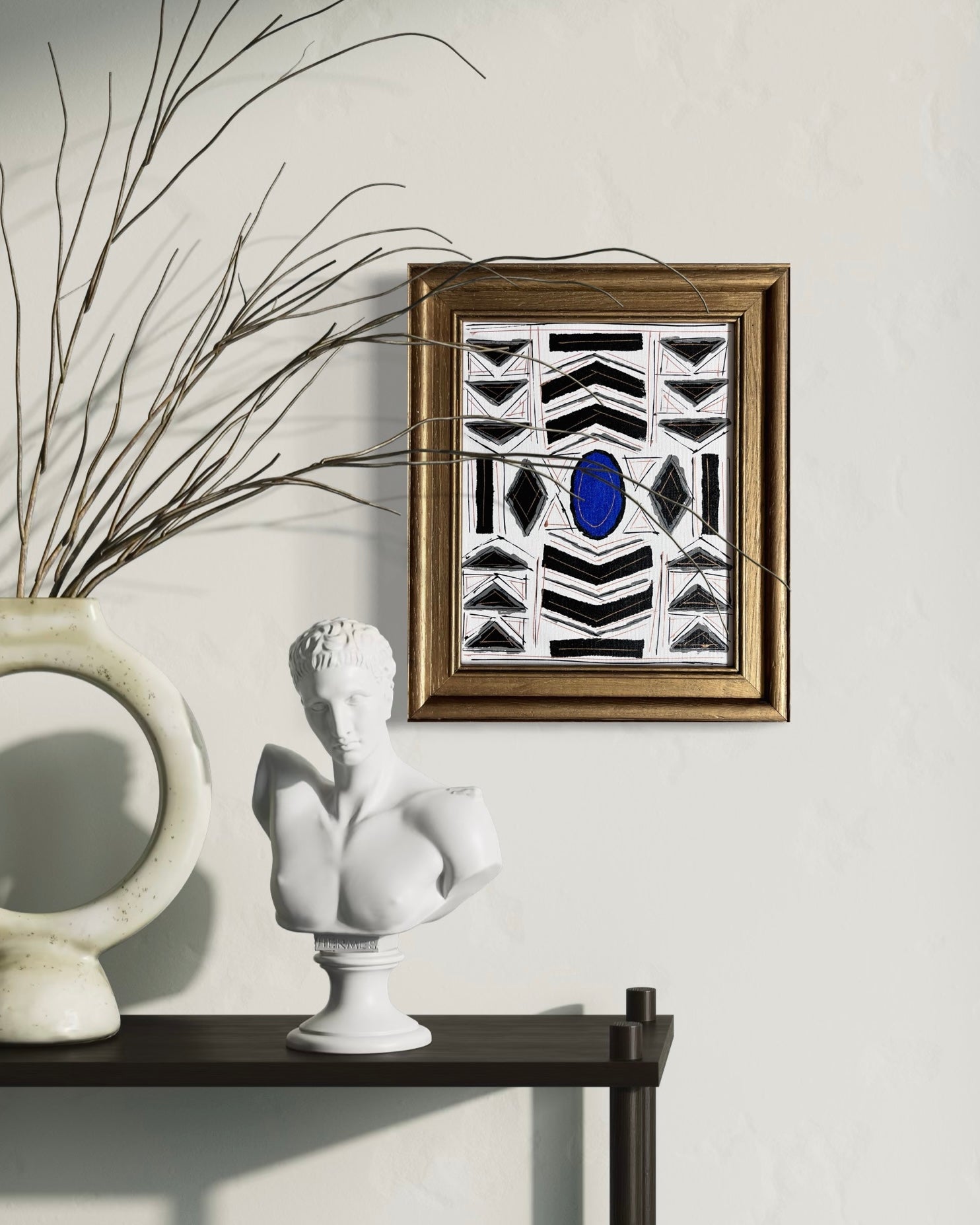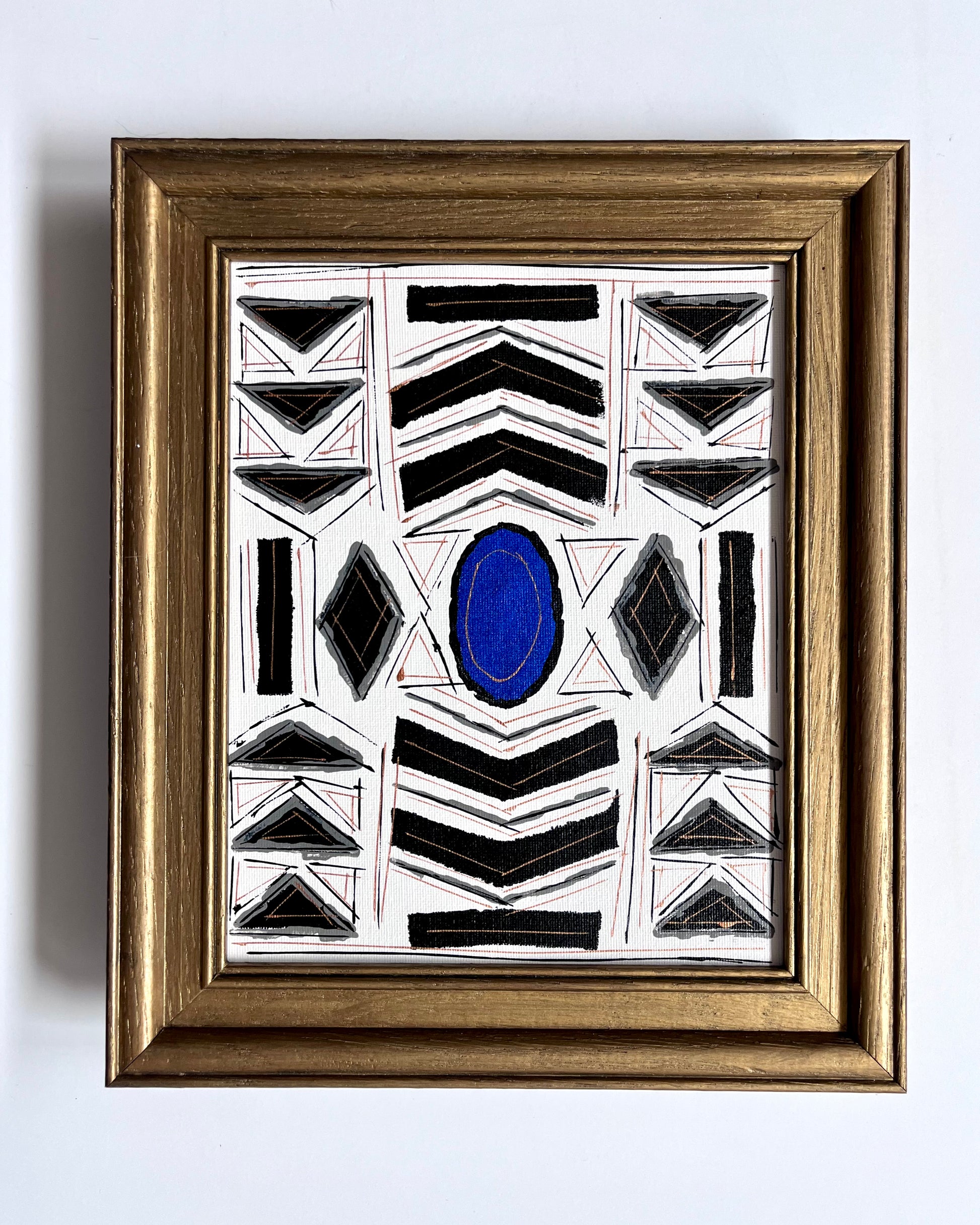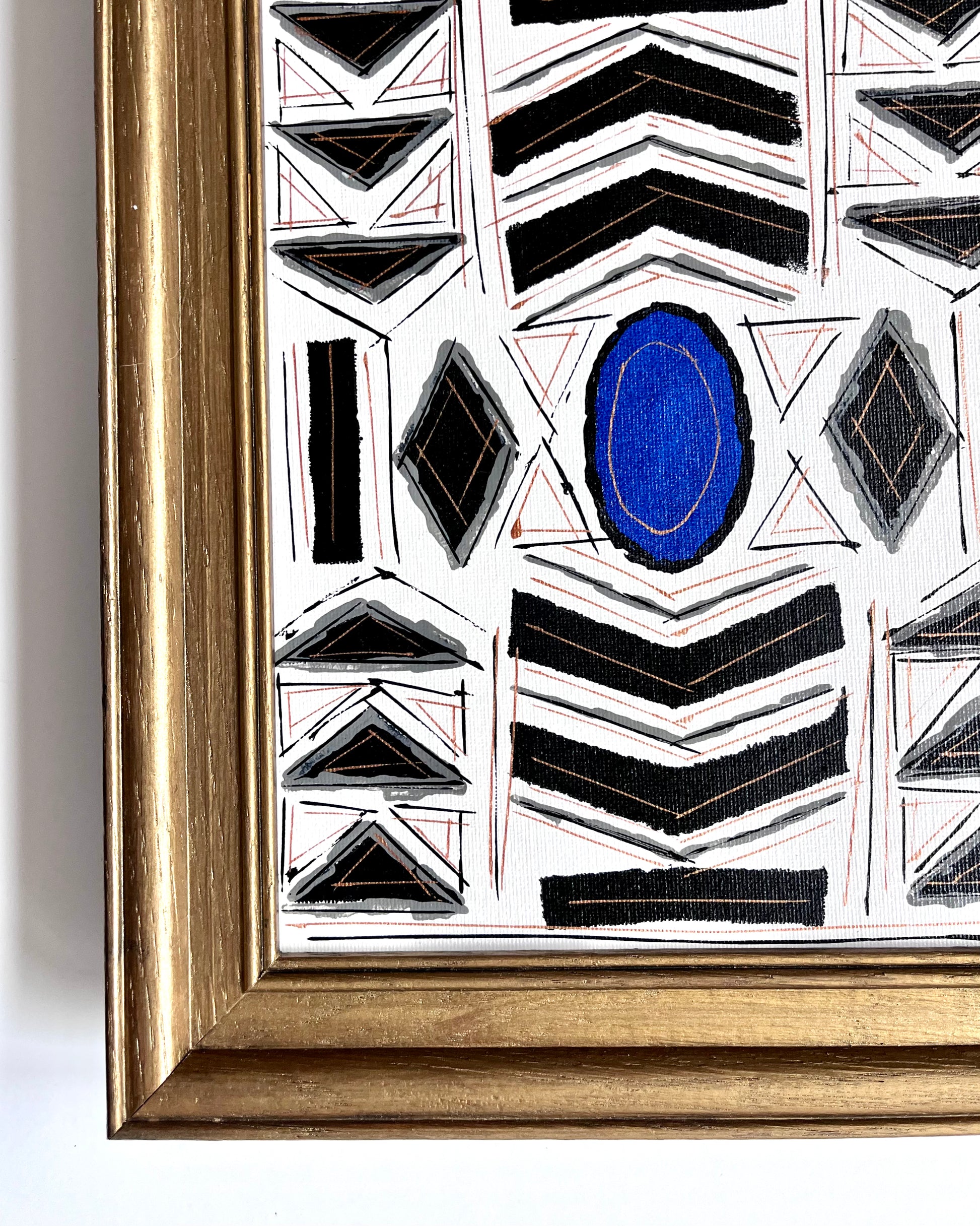 This 8"x10" original acrylic geometric painting offers a modern touch with its neutral palette of black and white, enhanced by a subtle hint of gold and blue.